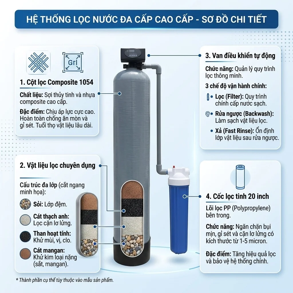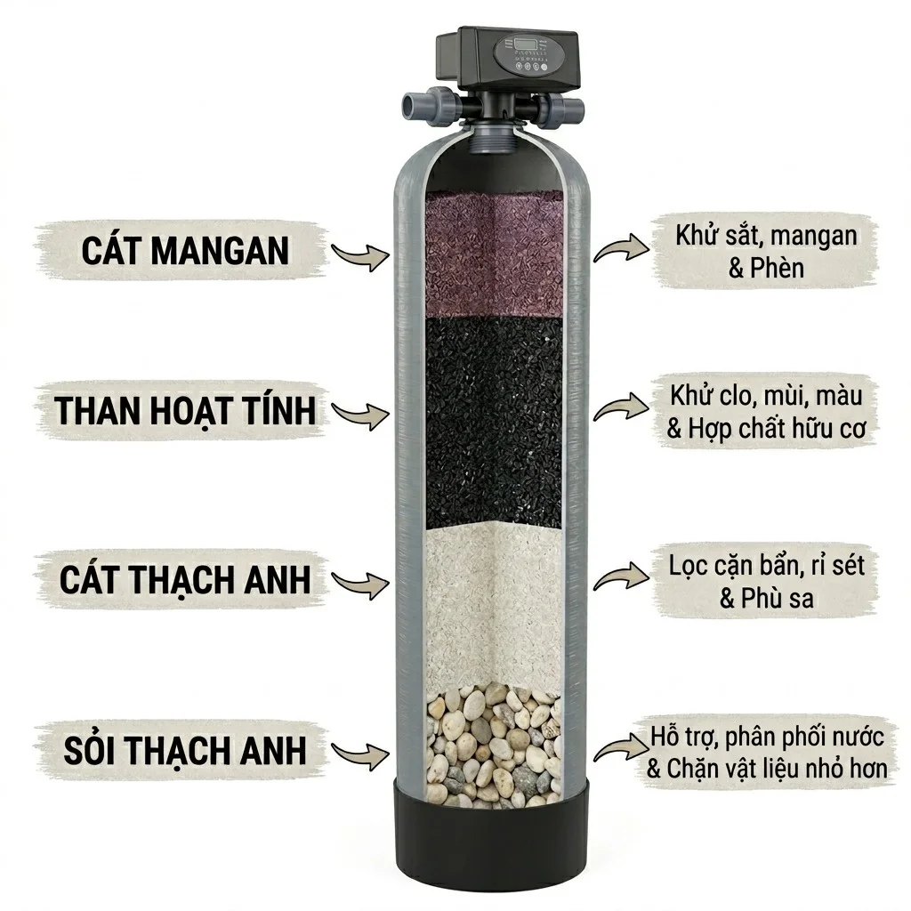 Tùy theo chất lượng nguồn nước và nhu cầu sử dụng, các lớp vật liệu trong cột lọc được phối hợp linh hoạt để đạt hiệu quả xử lý tối ưu. Hệ thống thường sử dụng các vật liệu sau: