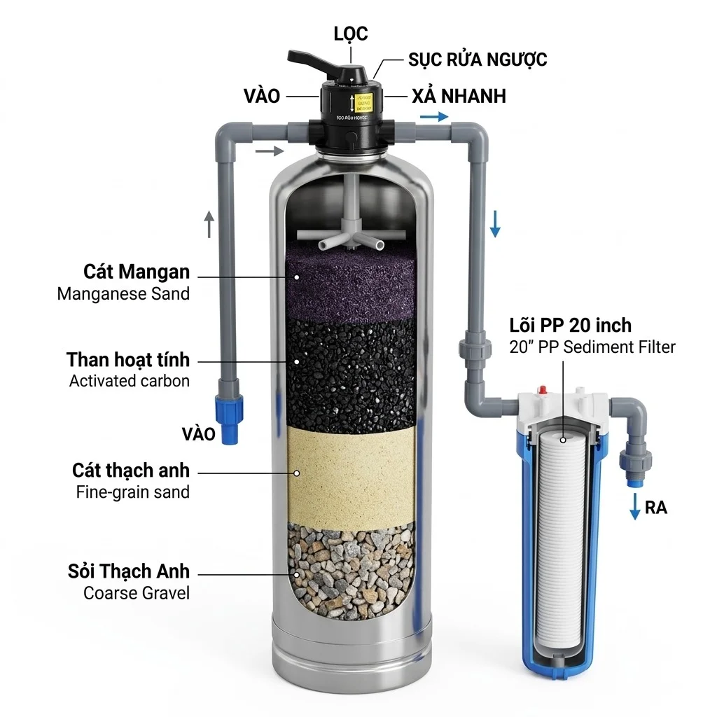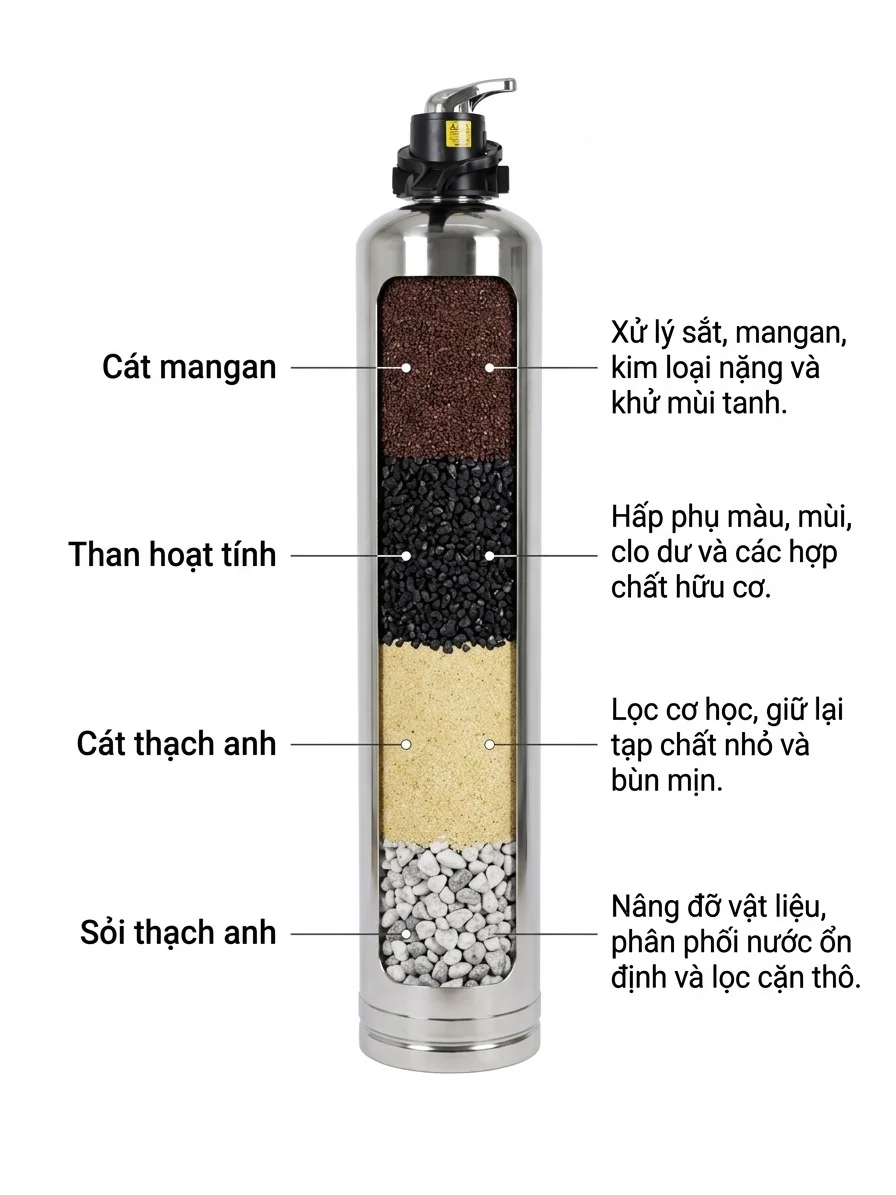 | Vật liệu lọc | Sỏi thạch anh, cát thạch anh, than hoạt tính, cát Mangan. |