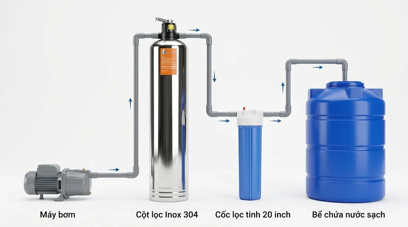 | Vị trí lắp đặt | Ngay trước hoặc ngay sau bồn chứa nước cả nhà |