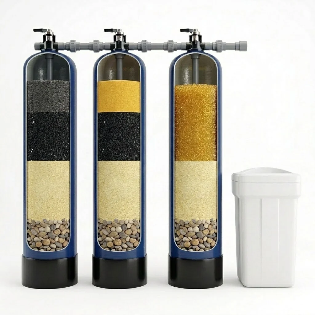 Cột 2: Sỏi thạch anh, cát thạch anh, than hoạt tính, hạt lọc phèn Cột 3: Sỏi thạch anh, cát thạch anh, Cation làm mềm nước, thùng muối hoàn nguyên |