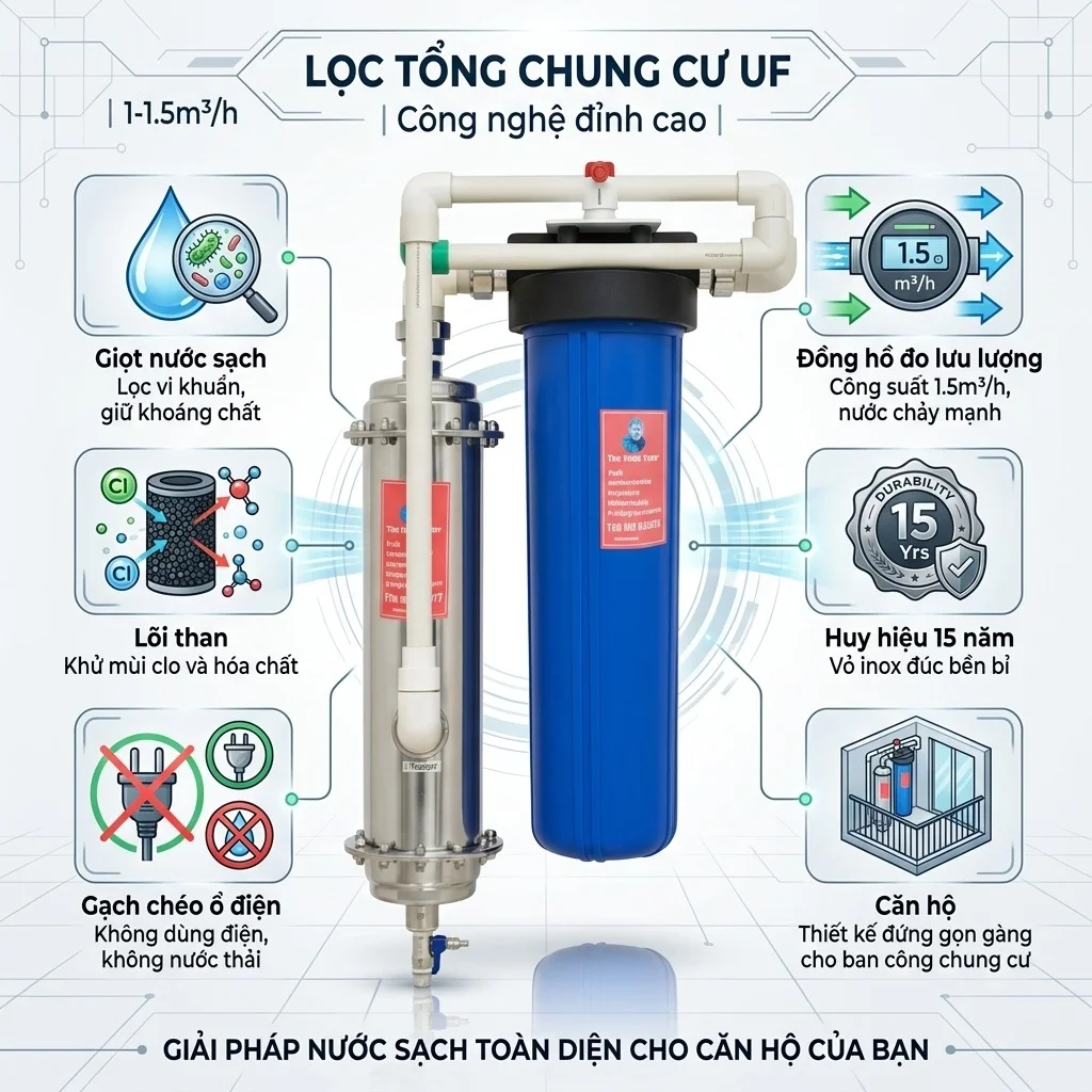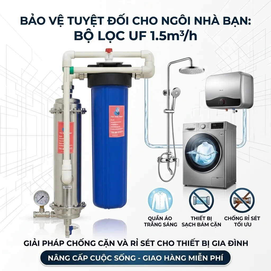 Bộ lọc tổng UF 1–1,5m³/h là sản phẩm bán chạy nhất trong danh mục lọc tổng chung cư của Tiến Thành Water, phù hợp với đa số gia đình từ 3-5 người đang cần giải pháp lọc nước đầu nguồn hiệu quả, vận hành bền bỉ và dễ bảo trì. Thiết bị được thiết kế để xử lý nước sinh hoạt ngay từ đầu vào, giúp loại bỏ cặn bẩn, mùi clo và tạp chất, từ đó bảo vệ đường ống, thiết bị trong nhà và nâng cao chất lượng nước sử dụng hằng ngày.