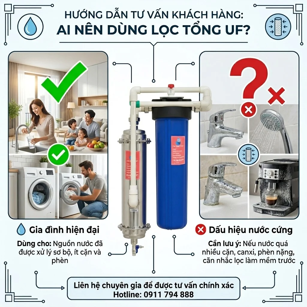 Bộ cột lọc 20 inch béo gồm hai lõi lọc chính: Bộ lọc nước đầu nguồn dành cho chung cư với công suất 1 – 1,5 m3/h sử dụng màng lọc UF (Ultra Filtration – siêu lọc) là loại màng lọc nước được làm từ các sợi rỗng siêu nhỏ với kích thước lỗ lọc từ 0,01 đến 0,1 micromet, nhỏ hơn rất nhiều so với kích thước sợi tóc con người (thường khoảng 50-70 micromet). Nhờ kích thước lỗ siêu nhỏ này, màng UF có khả năng lọc và loại bỏ các tạp chất như chất keo, chất rắn hòa tan kích thước nhỏ, vi khuẩn, vi sinh vật gây hại, một số virus, dầu mỡ, kim loại hydroxit, nhũ tương và các phân tử lớn có trong nước mà vẫn giữ lại được khoáng chất có lợi. Nước khi đi qua màng UF sẽ tinh khiết hơn nhưng vẫn còn giữ được các khoáng chất quan trọng cho sức khỏe. Khi sử dụng hệ thống lọc tổng UF, bạn sẽ nhận thấy sự thay đổi rõ rệt trong sinh hoạt hàng ngày: Phù hợp khi căn hộ có khoảng 3–5 thành viên sinh sống, nhu cầu sử dụng nước cùng lúc tại nhiều vị trí như vòi rửa, máy giặt, bình nóng lạnh. Hệ thống giúp lọc tổng thể, loại bỏ vi khuẩn và cặn bẩn trong toàn bộ nguồn nước sinh hoạt, đồng thời phù hợp với gia đình muốn sử dụng thiết bị bền, ít phải bảo trì và có thể lắp đặt gọn gàng tại ban công hoặc lô gia chung cư. Không phù hợp nếu nguồn nước khu vực có độ cứng cao, thường xuất hiện cặn trắng bám dày ở đầu vòi, ấm đun hoặc trong bình nóng lạnh. Với trường hợp này nên bổ sung thêm module làm mềm nước để đảm bảo hiệu quả lọc và tăng độ bền thiết bị. Liên hệ Tiến Thành Water qua hotline 0911 794 888 để được tư vấn cấu hình phù hợp với nguồn nước thực tế. Sau khi đặt hàng, kỹ thuật viên Tiến Thành Water sẽ chủ động liên hệ để xác nhận lịch và đến khảo sát thực tế căn hộ, bước này hoàn toàn miễn phí. Dựa vào vị trí đường nước, kỹ thuật viên sẽ tư vấn nơi lắp phù hợp như ban công, lô gia hoặc khu kỹ thuật để đảm bảo gọn gàng và dễ bảo trì. Quá trình lắp đặt thường diễn ra trong khoảng 1–2 giờ, không làm ảnh hưởng đến sinh hoạt của gia đình. Sau khi hoàn tất, khách hàng được hướng dẫn cách xả cặn, vận hành hệ thống và cung cấp lịch thay lõi định kỳ. Tiến Thành Water nhận lắp đặt tại tất cả các tỉnh thành trên toàn quốc. Kỹ thuật viên có thể đến trong ngày hoặc theo lịch hẹn trước, đảm bảo đúng thời gian và đúng quy trình.Cấu tạo của bộ lọc nước sinh hoạt cho chung cư UF 1-1.5m3/h