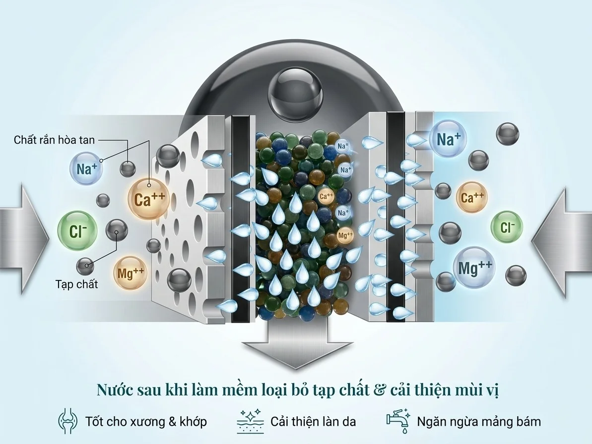 | Công nghệ | Trao đổi Ion & Carbon Block (Không điện, không nước thải) |