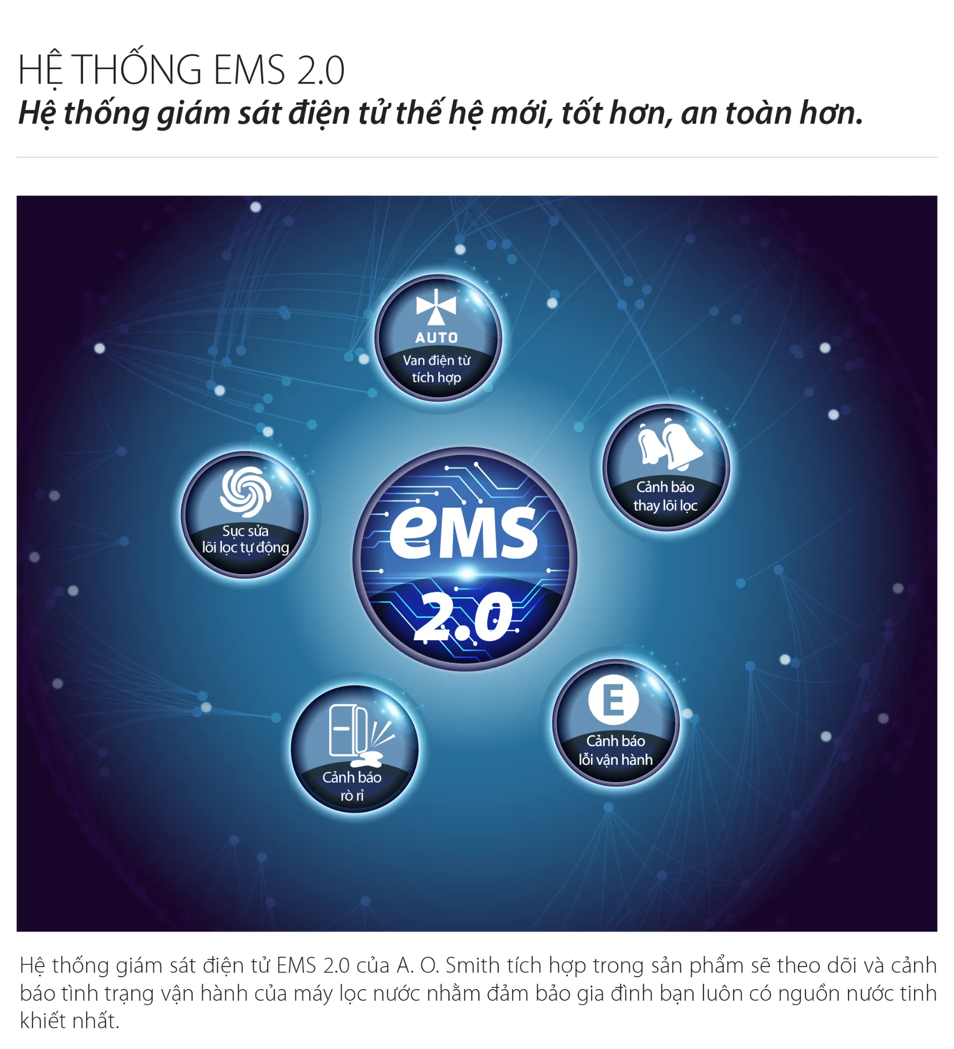 AOSmith AR75-A-S-H1 sở hữu hệ thống điện tử EMS tích hợp, liên tục theo dõi và cảnh báo tình trạng vận hành của máy để đảm bảo chất lượng nước luôn ở mức tinh khiết nhất: