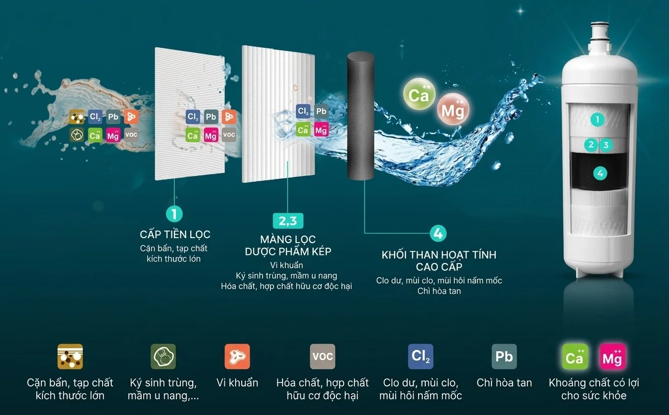Với khả năng lọc sạch các tác nhân gây hại có kích thước siêu nhỏ tới 0.2 micron, máy loại bỏ đến 98% Clo dư, vi khuẩn và các mầm bệnh tiềm ẩn. Tuy nhiên, nguồn nước sau lọc vẫn giữ lại được các khoáng chất tự nhiên cần thiết, giúp quá trình chiết xuất trà và cà phê đạt được hương vị chuẩn xác nhất.