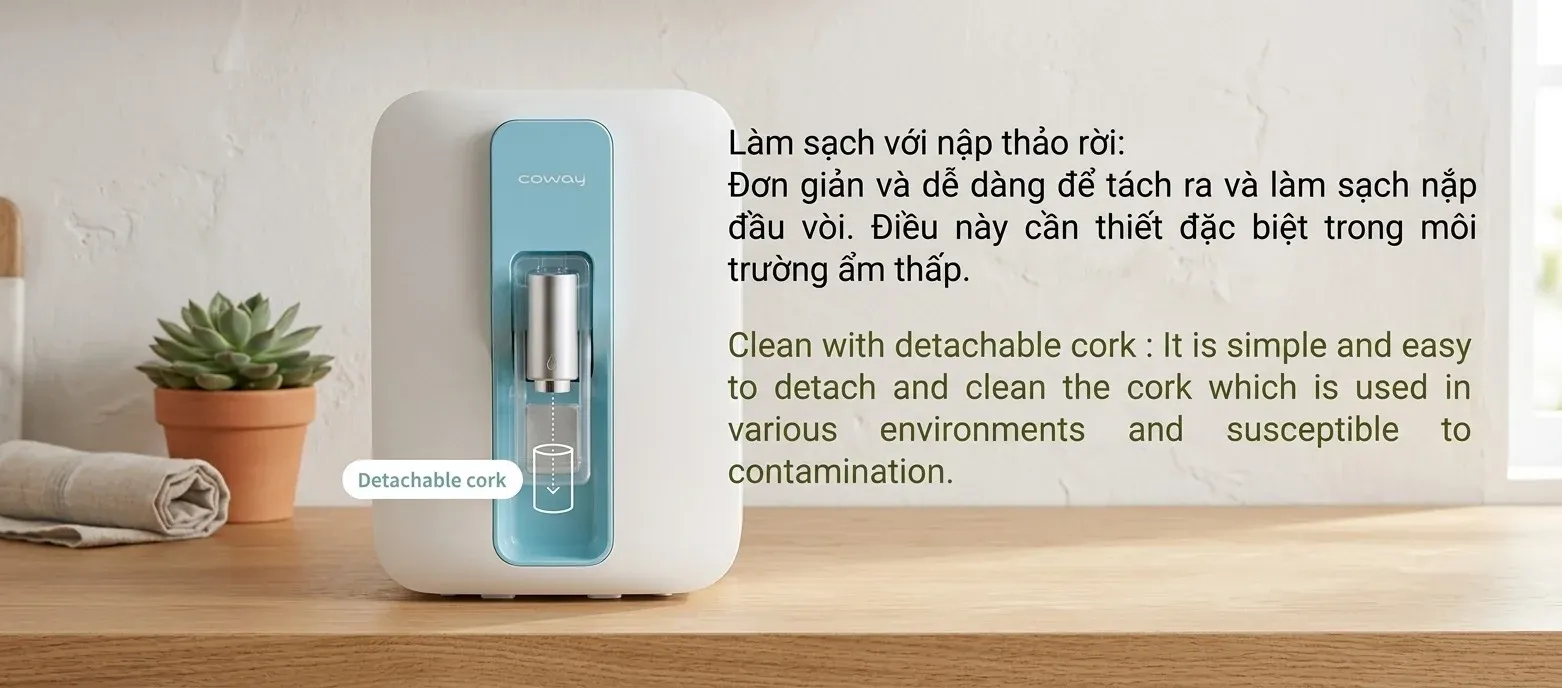 Coway chú trọng đến từng chi tiết nhỏ để bảo vệ sức khỏe người dùng. Đầu vòi nước của máy được thiết kế thông minh, có thể tháo rời một cách đơn giản. Điều này cho phép bạn chủ động vệ sinh vòi lấy nước thường xuyên, ngăn chặn triệt để nguy cơ vi khuẩn tích tụ tại vị trí tiếp xúc cuối cùng trước khi nước vào ly.