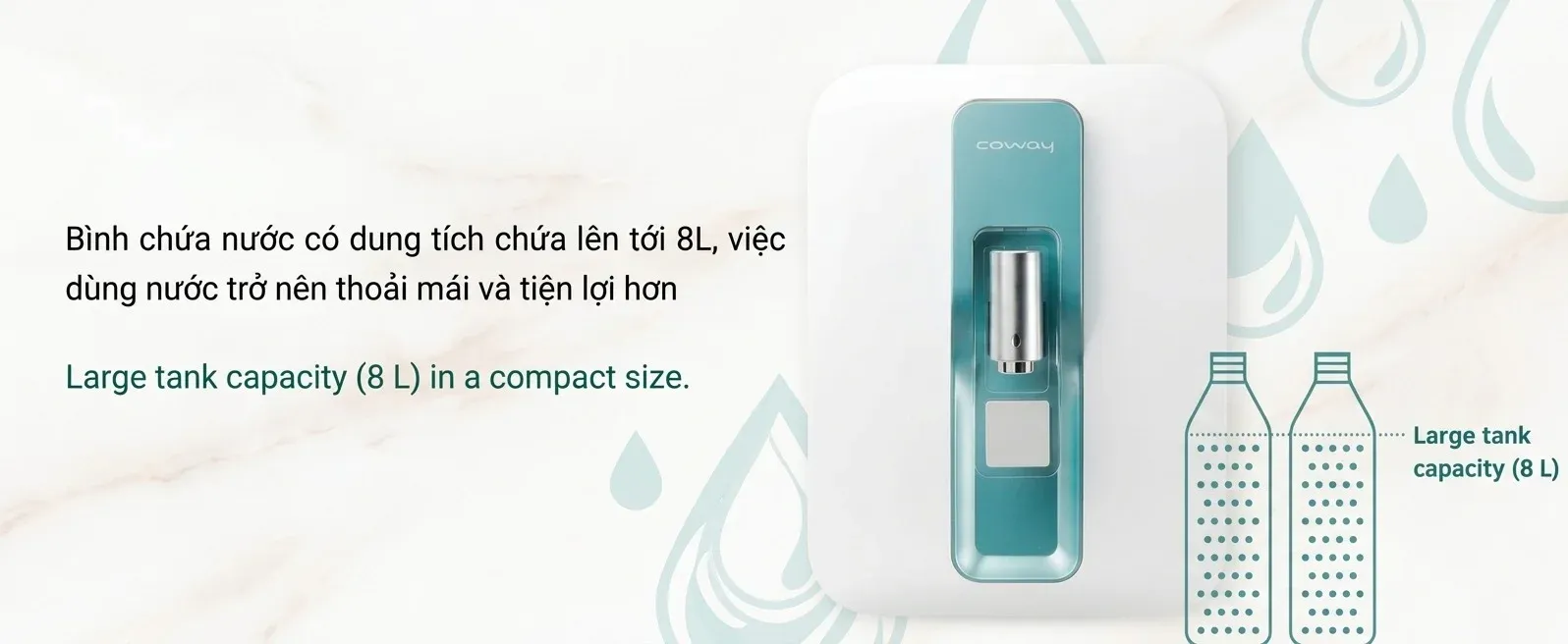 Mặc dù sở hữu vẻ ngoài cực kỳ nhỏ gọn, tối ưu không gian để bàn, nhưng Coway P-300R lại gây bất ngờ với dung tích bình chứa lên đến 8 Lít. Sự kết hợp này giúp máy vừa vặn với mọi gian bếp hiện đại, đồng thời đảm bảo cung cấp đủ lượng nước sạch cho cả gia đình từ 4-8 người sử dụng thoải mái mà không cần chờ đợi.