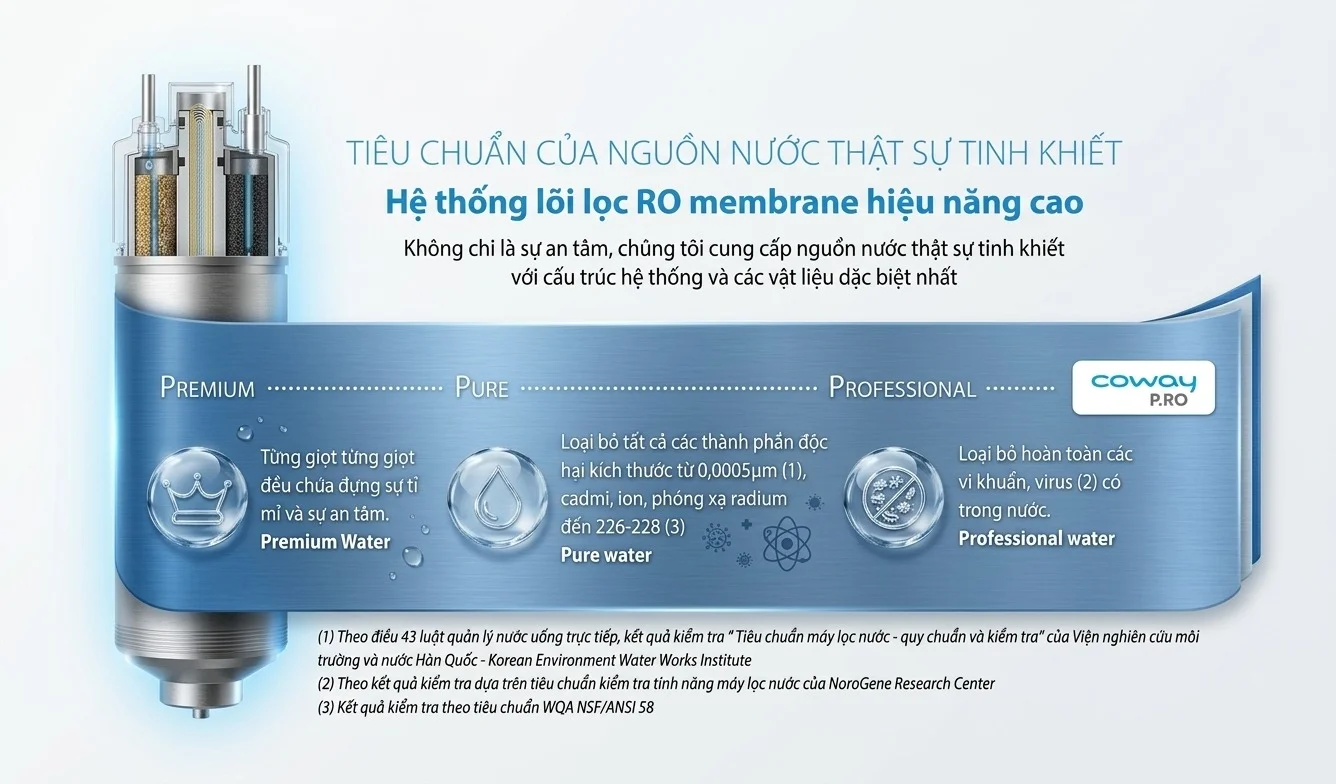Sản phẩm sử dụng màng lọc RO tiên tiến với khả năng lọc bỏ các thành phần độc hại có kích thước siêu nhỏ, chỉ từ 0,0005µm. Công nghệ này loại bỏ hiệu quả các ion kim loại nặng, chất phóng xạ và các hợp chất hóa học, mang lại nguồn nước tinh khiết đạt chuẩn quốc tế NSF/ANSI 58, an toàn tuyệt đối để uống trực tiếp.