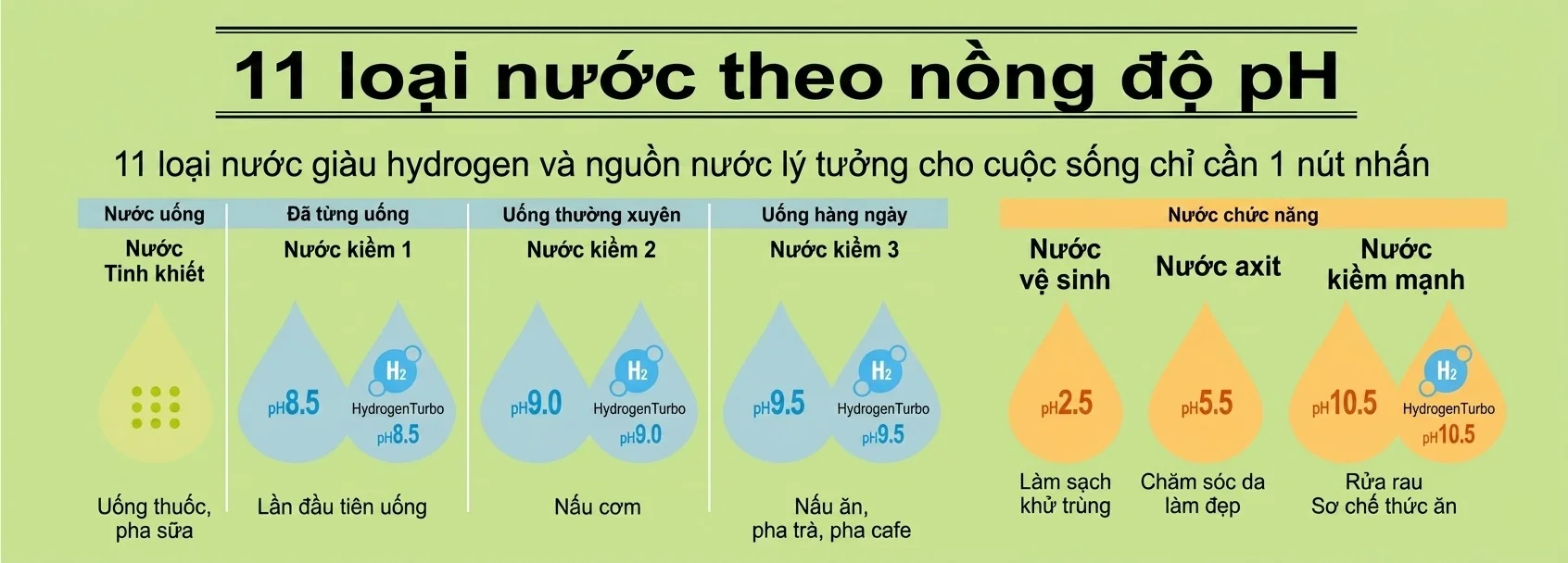 • 11 loại nước chức năng dải pH từ 2.5 đến 10.5.
