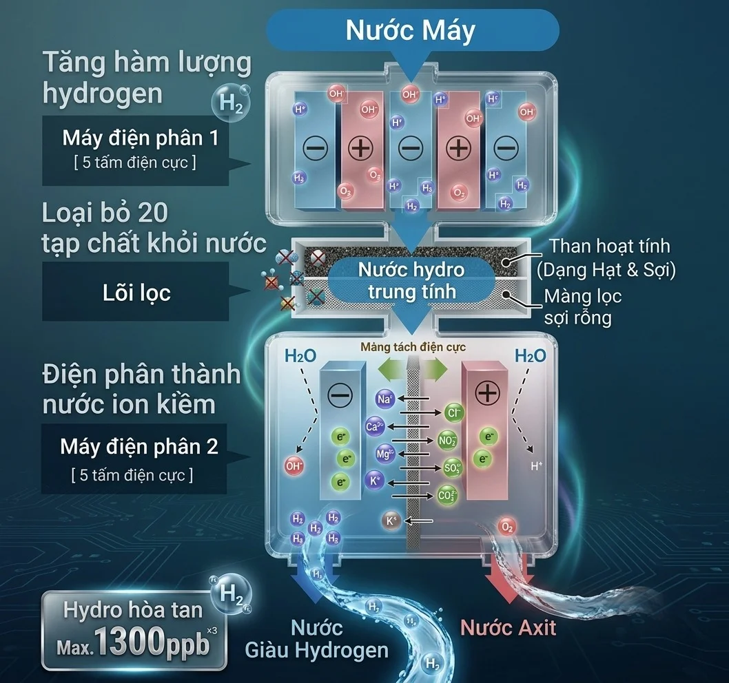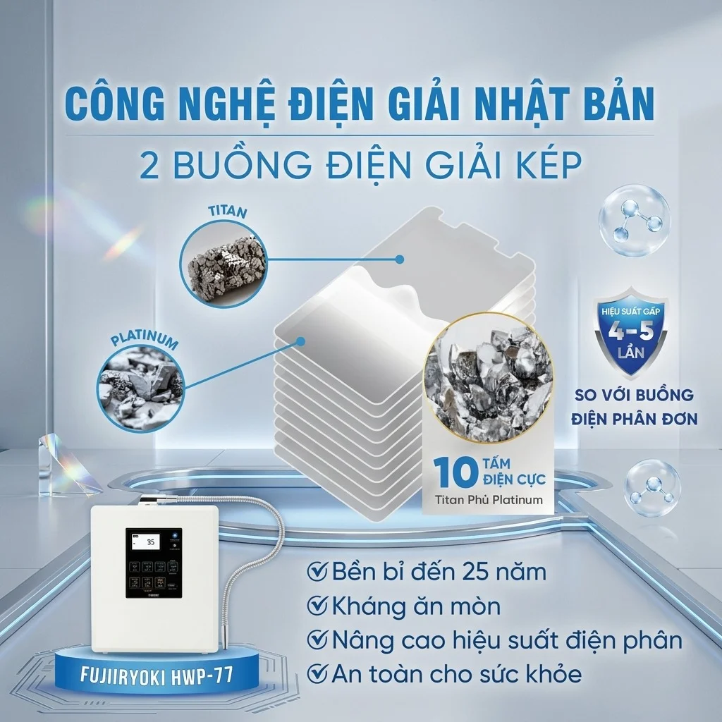 • 10 tấm điện cực Platinum cùng 2 buồng điện phân kép.