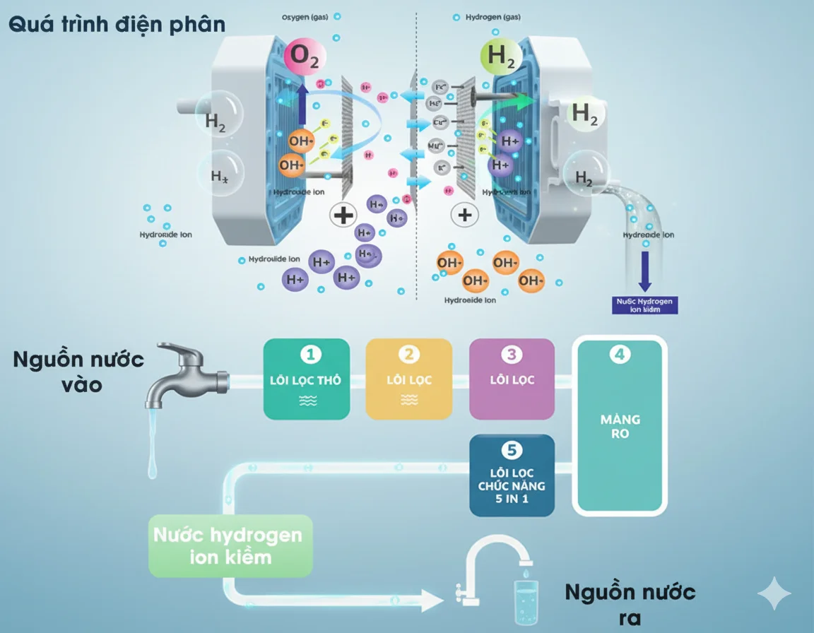 Công nghệ lọc | RO kết hợp điện phân, tạo nước ion kiềm giàu Hydrogen |