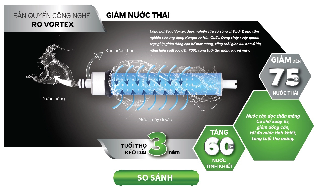 Điểm khác biệt lớn nhất của KG100HQ chính là màng lọc RO Vortex. Thay vì dòng chảy dọc như các màng lọc thông thường, công nghệ Vortex tạo ra dòng chảy xoáy quanh trục màng. Điều này giúp tăng hiệu quả lọc, giảm đóng cặn và nâng cao tỷ lệ thu hồi nước tinh khiết lên đến 69%. Đồng thời, công nghệ này còn giúp tiết kiệm tới 75% lượng nước thải và kéo dài tuổi thọ màng lọc lên đến 3 năm.