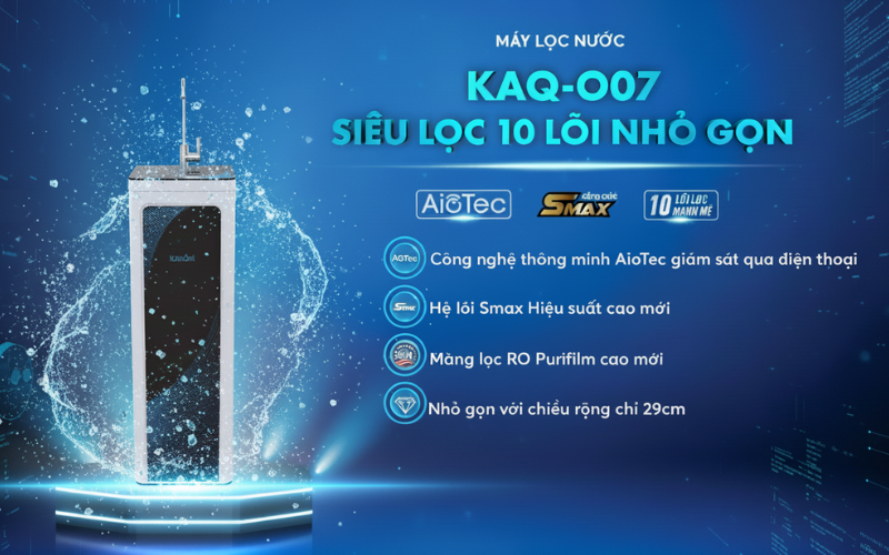 Karofi KAQ-O07 là dòng máy lọc nước thế hệ mới với thiết kế gọn gàng, hiện đại và nhiều tính năng thông minh, mang đến nguồn nước tinh khiết cho gia đình. Sản phẩm được cải tiến toàn diện từ thiết kế đến công nghệ, vừa đảm bảo nước sạch an toàn, vừa tạo điểm nhấn sang trọng cho không gian sống. KAQ-O07 là lựa chọn tiêu biểu, đáp ứng tốt nhu cầu sử dụng hằng ngày và mang lại sự hài lòng cho người dùng. Máy lọc nước Karofi KAQ-O07 có khả năng kết nối với điện thoại qua ứng dụng Karofi 360 và Wi-Fi, cho phép người dùng theo dõi trạng thái máy mọi lúc, mọi nơi. Hệ thống mạch thông minh tích hợp trong máy tự động đo tuổi thọ các linh kiện và gửi thông tin trực tiếp lên ứng dụng, đồng thời thông báo mọi hoạt động của nguồn nước để dễ dàng giám sát và can thiệp khi cần. Công nghệ này còn giúp người dùng hưởng tiện ích hậu mãi nhanh chóng, bao gồm kích hoạt bảo hành tự động, kiểm tra chính sách bảo hành và xác thực sản phẩm chính hãng một cách đơn giản. Karofi KAQ-O07 với chiều ngang chỉ 29 cm, nằm trong nhóm máy lọc nước tủ đứng nhỏ gọn nhất. Kiểu dáng hiện đại với sắc xanh dương tinh tế vừa tạo điểm nhấn sang trọng vừa tôn vinh nguồn nước tinh khiết. Máy lọc nước Karofi KAQ-O07 được trang bị màn hình LED hiện đại, giúp người dùng thuận tiện giám sát và điều khiển hoạt động của máy. Hệ thống hiển thị thông minh cung cấp đầy đủ thông tin: Máy lọc nước Karofi KAQ-O07 không chỉ nổi bật với thiết kế hiện đại và công nghệ thông minh, mà còn được chứng nhận đạt chuẩn Quốc gia về chất lượng nước uống tinh khiết. Sản phẩm đáp ứng cả QCVN 6-1:2010/BYT và TCVN 11978:2017, đảm bảo nguồn nước sạch an toàn tuyệt đối cho sức khỏe gia đình. Khi sở hữu máy lọc nước Karofi KAQ-O07, khách hàng sẽ được hưởng chế độ bảo hành chính hãng dài hạn lên đến 36 tháng. Đây là cam kết mạnh mẽ từ Karofi nhằm mang lại sự yên tâm tuyệt đối cho người dùng trong suốt quá trình sử dụng. Máy lọc nước Karofi KAQ-O07 không chỉ mang đến nguồn nước tinh khiết, an toàn mà còn sở hữu thiết kế sang trọng, công nghệ hiện đại và độ bền vượt trội. Với nhiều ưu điểm nổi bật, sản phẩm này xứng đáng là giải pháp chăm sóc sức khỏe và nâng cao chất lượng cuộc sống cho mỗi gia đình. Nếu bạn đang tìm kiếm một chiếc máy lọc nước chất lượng, tiện lợi và tiết kiệm, Karofi KAQ-O07 chắc chắn sẽ là lựa chọn đáng cân nhắc.Một số thông tin về máy KAQ O07