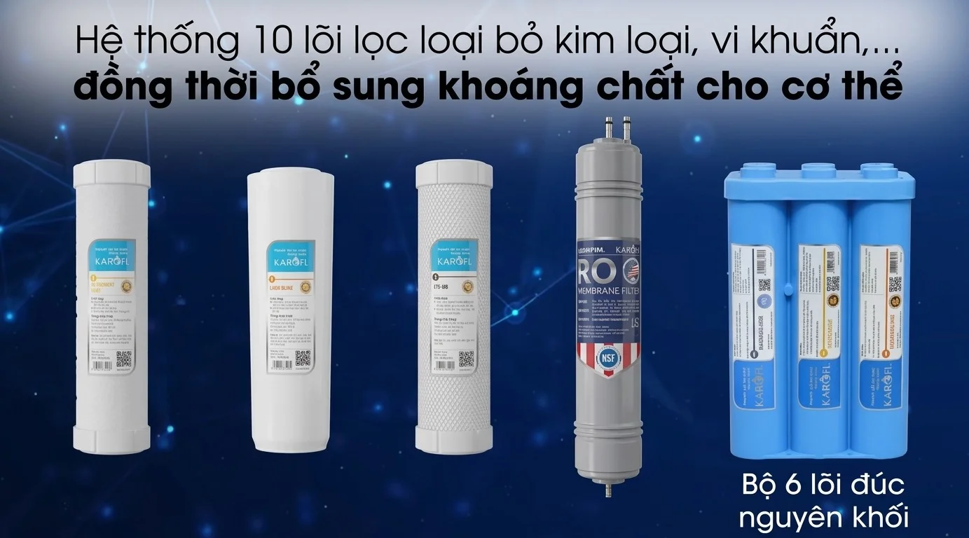 Sản phẩm vừa đảm bảo nguồn nước đạt chuẩn chất lượng, vừa cung cấp các khoáng chất cần thiết giúp hỗ trợ và bảo vệ sức khỏe của người dùng. Cụ thể: bộ lọc máy lọc nước Karofi KAQ-U95 bao gồm: 3 LÕI LỌC THÔ, màng RO, 6 LÕI LỌC CHỨC NĂNG.