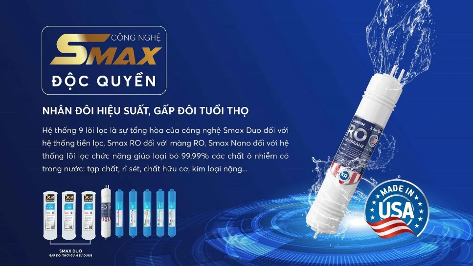 | Hệ thống lọc | 9 lõi (Smax Duo 2 New, Màng RO Mỹ, T33-GAC, Mineral, Far Infrared, ORP Alkaline, NanoSilver) |
