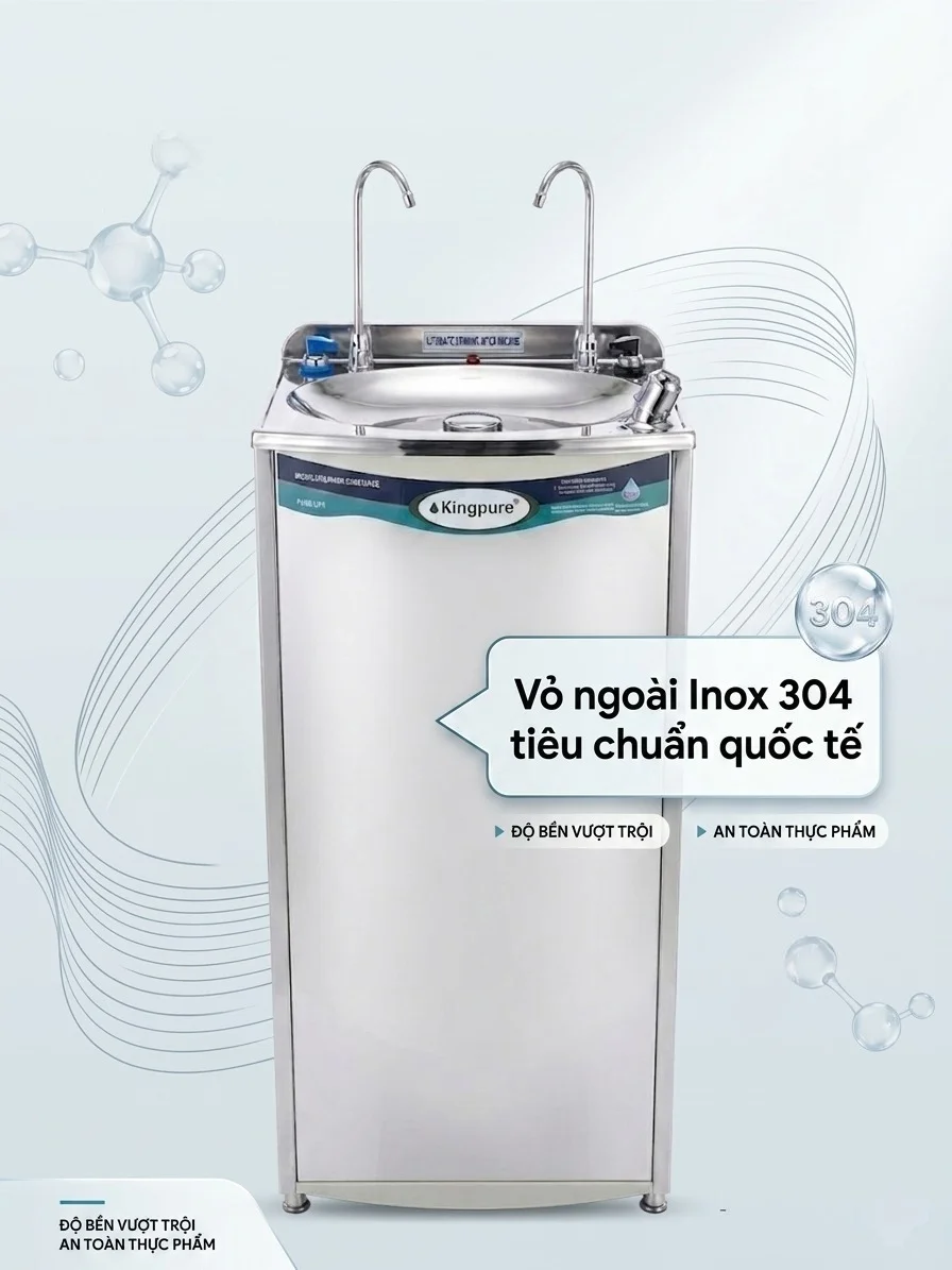 Khác với các dòng máy vỏ nhựa thông thường, Kingpure sử dụng Inox SS304 cao cấp cho toàn bộ lớp vỏ ngoài. Đặc tính của Inox 304 là khả năng chống ăn mòn, không gỉ sét, cực kỳ bền bỉ trong môi trường ẩm ướt và rất dễ vệ sinh. Điều này không chỉ bảo vệ các linh kiện bên trong mà còn giữ cho máy luôn sáng bóng như mới sau nhiều năm sử dụng.