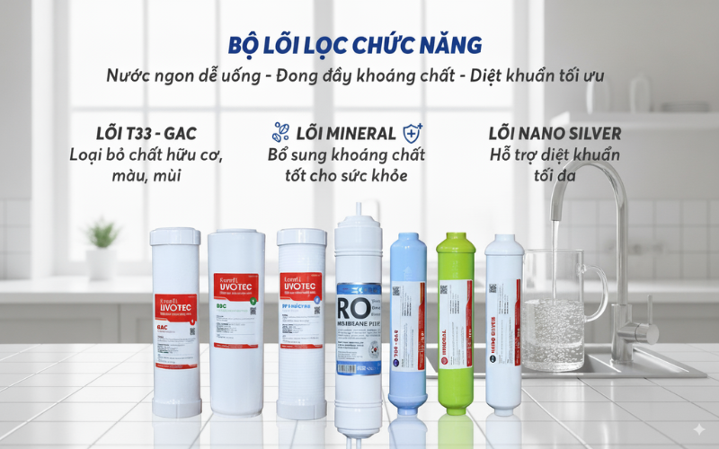 | Hệ thống lọc & cấu hình | Lọc thô: – Nước thường: PP5 → GAC → PP1 – Nước cứng: PP5 → Cation → CTO Màng RO Lõi chức năng: T33-GAC, Khoáng đá (Mineral), Alkaline, Hồng ngoại xa, Nano Bạc |