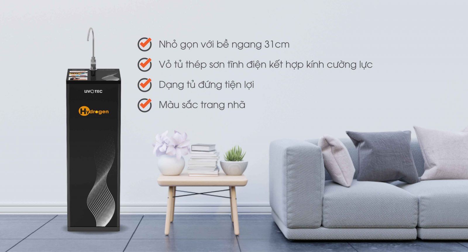 Với chiều ngang chỉ 31cm siêu nhỏ gọn, hình khối sắc nét, và kiểu dáng bắt mắt, sản phẩm Máy lọc nước karofi Livotec LRC110-H dễ dàng hòa hợp với các đồ nội thất khác, tạo nên một điểm nhấn tinh tế cho căn nhà. Máy lọc nước LRC110-H sử dụng chất liệu sơn tĩnh điện kết hợp kính cường lực giúp mang lại vẻ ngoài bền đẹp qua năm tháng.