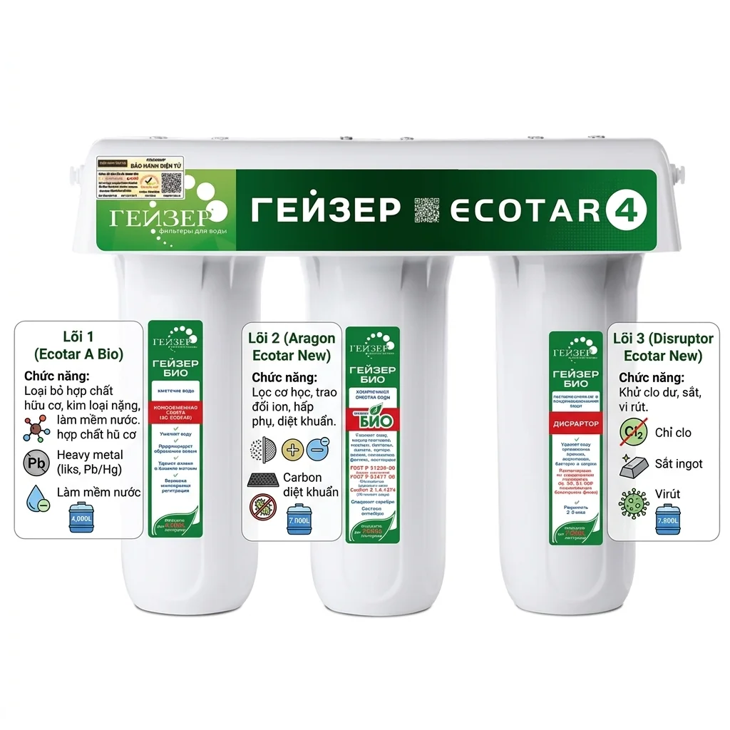 Trong bối cảnh nguồn nước tại Việt Nam ngày càng trở nên phức tạp với các vấn đề về nhiễm phèn, kim loại nặng và vi khuẩn, việc lựa chọn một thiết bị lọc nước an toàn là ưu tiên hàng đầu. Máy lọc nước Nano Geyser Ecotar 4, nhập khẩu nguyên chiếc từ Liên bang Nga, là dòng sản phẩm được nghiên cứu riêng để giải quyết triệt để những đặc thù nguồn nước tại nước ta.