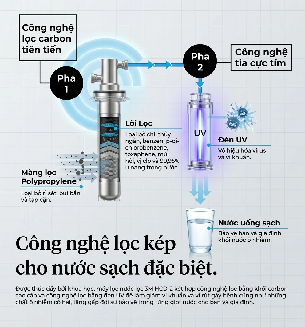 Điểm khác biệt lớn nhất của 3M HCD-2 chính là sự kết hợp giữa hệ thống lọc 3M™ AP2-C405SG và đèn UV diệt khuẩn. Cơ chế bảo vệ kép này giúp: