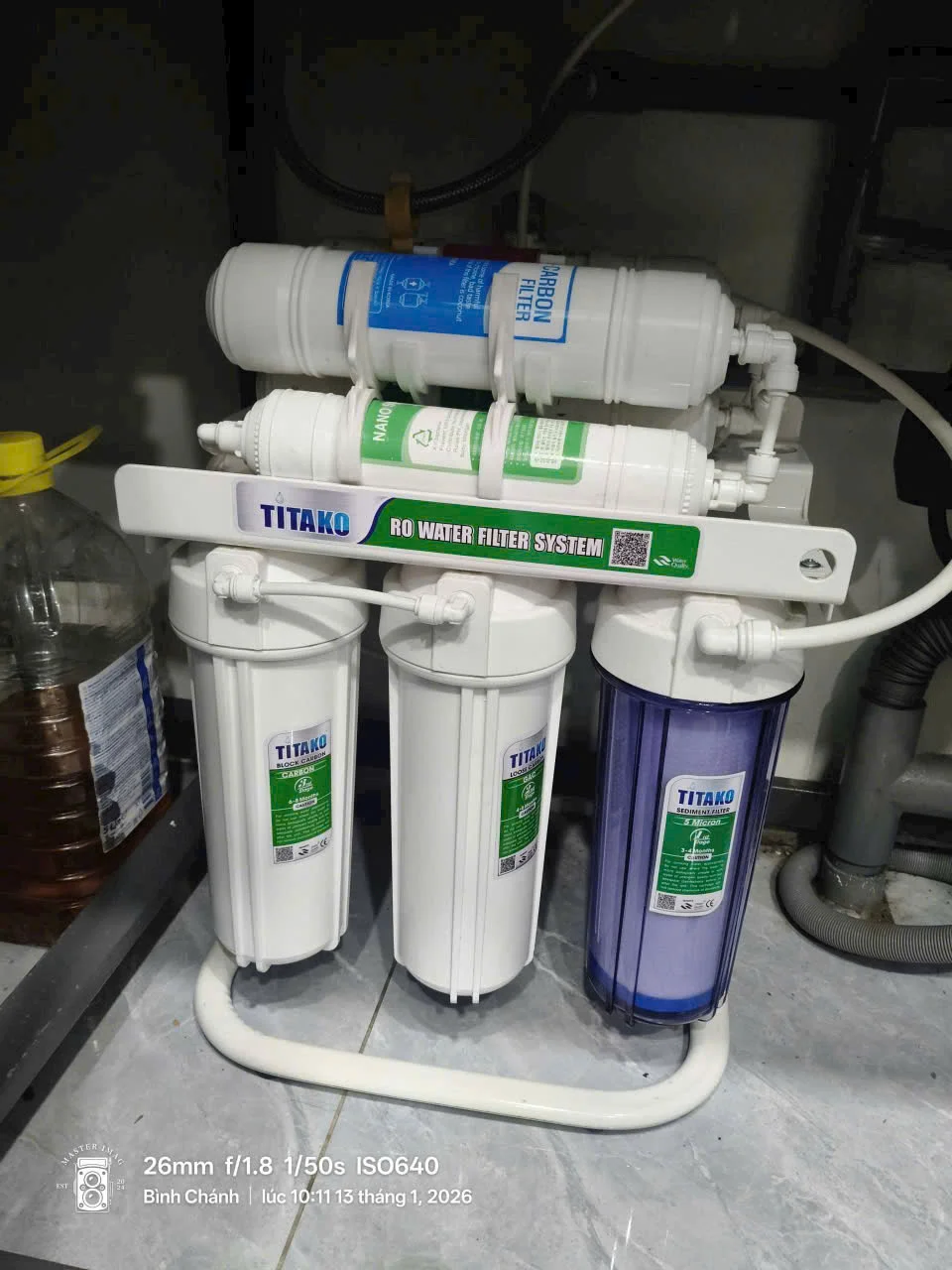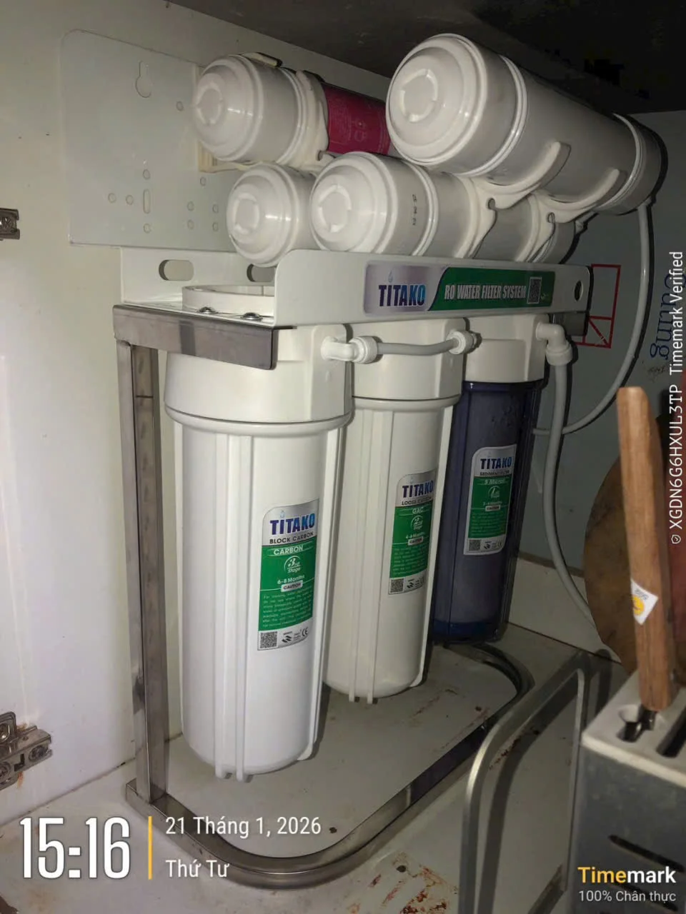 Máy lọc nước Titako A3 là một sản phẩm thuộc thương hiệu máy lọc nước Titako sử dụng màng siêu lọc UF, giúp loại bỏ tạp chất và vi khuẩn nhưng vẫn giữ lại các khoáng chất cần thiết, đảm bảo nguồn nước nguyên khoáng an toàn. Với thiết kế nhỏ gọn, máy không cần tủ hay máy bơm, rất tiện ích cho việc lắp đặt trong căn nhà bạn. Một ưu điểm nổi bật là máy không tạo ra nước thải, giúp bảo vệ môi trường và tiết kiệm nước. Các linh kiện quan trọng của máy được nhập khẩu và sản xuất trực tiếp bởi Công ty Tiến Thành Water, với lõi lọc chất lượng cao từ Hàn Quốc, đảm bảo độ bền và hiệu suất lọc lâu dài. Màng siêu lọc UF không chỉ hiệu quả mà còn rất an toàn, mang đến nguồn nước sạch và an toàn cho sức khỏe gia đình bạn. Khác với dòng Titako A2 sử dụng công nghệ RO với 9 lõi lọc, máy lọc nước Titako A3 nổi bật với công nghệ UF cùng 7 lõi lọc thông minh. Dưới đây là quy trình lọc nước chi tiết theo thứ tự hoạt động của Titako A3, sản xuất trực tiếp bởi Tiến Thành Water, đảm bảo nguồn nước sạch nguyên khoáng cho gia đình bạn. Lõi số 1 PP 5 Micron là lớp lọc thô đầu tiên trong hệ thống 7 lõi của máy lọc nước Titako A3. Với chất liệu Polypropylene cao cấp và khe hở chỉ 5 micron (1 micron = 1/1000 mm), lõi này có nhiệm vụ quan trọng trong việc bảo vệ nguồn nước của bạn. Chức năng chính của lõi PP 5 Micron: Lõi có tuổi thọ từ 3 đến 6 tháng, tùy thuộc vào chất lượng nguồn nước bạn sử dụng. Để đảm bảo hiệu quả lọc tối ưu, bạn nên thay lõi định kỳ theo khuyến cáo. Lõi số 2 – OCB (Than hoạt tính) là lớp lọc tiếp theo trong hệ thống 7 lõi của Titako A3. Lõi này chuyên xử lý các tạp chất hóa học và cải thiện chất lượng nước. Với cấu trúc xốp rỗng và các vi mạch, than hoạt tính có khả năng hấp thụ mạnh mẽ các chất hòa tan mà không hút nước, giúp loại bỏ dầu mỡ và hóa chất hiệu quả. Chức năng chính của lõi OCB: Lõi OCB có tuổi thọ từ 4 đến 6 tháng, tùy thuộc vào chất lượng nước đầu vào. Để duy trì hiệu quả lọc tốt nhất, bạn nên thay lõi định kỳ theo khuyến cáo. Lõi số 3 – CTO (Than hoạt tính nén) là một phần quan trọng trong hệ thống 7 lõi của Titako A3. Lõi này nổi bật với khả năng khử clo, loại bỏ mùi vị và hương vị không mong muốn trong nước. Được làm từ than nén dạng khối, lõi CTO có hàm lượng carbon cao và diện tích bề mặt rộng, giúp quá trình lọc diễn ra nhanh chóng và hiệu quả hơn. Chức năng chính của lõi CTO: Lõi CTO có tuổi thọ từ 6 đến 8 tháng, tùy thuộc vào chất lượng nước đầu vào. Để đảm bảo hiệu quả lọc tối ưu và nguồn nước luôn sạch, tinh khiết, bạn nên thay lõi định kỳ theo khuyến cáo. Lõi số 4 – Sediment là bộ phận quan trọng trong hệ thống 7 lõi của dòng máy A3, có nhiệm vụ chính là loại bỏ các tạp chất cơ học có kích thước lớn trong nước. Lõi Sediment chuyên xử lý cặn bẩn, rỉ sét, bọ gậy và rong rêu, đảm bảo nguồn nước đầu vào luôn sạch sẽ và an toàn hơn. Chức năng chính của lõi Sediment: Lõi Sediment có tuổi thọ lên đến 12 tháng, vì vậy bạn nên thay định kỳ để bảo vệ hệ thống lọc và đảm bảo hiệu suất tối ưu. Lõi số 5 UF (Màng siêu lọc) là một thành phần thiết yếu trong hệ thống 7 lõi của Titako A3. Lõi này đóng vai trò quan trọng trong việc đảm bảo nguồn nước đầu ra không chỉ tinh khiết và an toàn mà còn giàu khoáng chất, mà không cần sử dụng điện hay hóa chất. Màng siêu lọc của lõi UF có các lỗ cực nhỏ, giúp ngăn chặn vi rút, vi khuẩn và các hạt tạp chất siêu nhỏ còn sót lại trong nước, kể cả những hạt chỉ bằng 1/1000 mm. Chức năng chi tiết của lõi UF: Với tuổi thọ lên đến 18 tháng, lõi UF cần được thay định kỳ để duy trì hiệu suất lọc tối ưu, đảm bảo nguồn nước luôn sạch, tinh khiết và an toàn cho sức khỏe lâu dài. Lõi số 6 PreCarbon (Than hoạt tính tiền lọc) là một thành phần quan trọng trong hệ thống 7 lõi của dòng máy này Lõi này chuyên trách nhiệm xử lý các tạp chất hóa học và cải thiện mùi vị của nước. Được chế tạo từ than hoạt tính chất lượng cao, PreCarbon có khả năng hấp thụ mạnh mẽ các hợp chất hữu cơ và kim loại nặng còn tồn đọng trong nước. Chức năng chi tiết của lõi PreCarbon: Lõi PreCarbon có tuổi thọ khoảng 12 tháng vì vậy bạn cần phải đảm bảo thay lõi đúng hạn Lõi số 7 Nano Silver là lớp lọc cuối cùng, có nhiệm vụ đảm bảo nước đầu ra hoàn toàn sạch, an toàn và tinh khiết. Lõi này ứng dụng công nghệ Nano với Ion Bạc (Ag+), giúp khử mùi và tiêu diệt tới 99,9% vi khuẩn, vi nấm còn lại trong nước. Chức năng chi tiết của lõi Nano Silver: Lõi được chế tạo từ than hạt phủ Nano bạc, có màu xám bạc hoặc xanh, với tuổi thọ lên đến 18 tháng (tương đương 7.500 lít nước). Điều này giúp duy trì hiệu quả lọc tối ưu và đảm bảo nguồn nước luôn sạch, an toàn cho cả gia đình. Sản ph