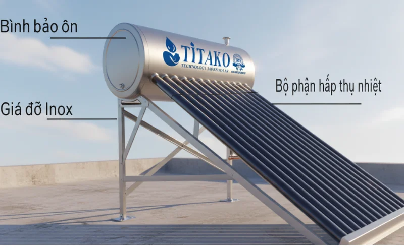 - Bình bảo ôn: Ruột bình chế tạo từ Inox 304 dày 0,4 mm, bền bỉ, chống gỉ sét và an toàn cho nguồn nước. Lớp cách nhiệt là hợp chất Foam dày 55 mm, giúp giữ nhiệt hiệu quả lên tới 96 giờ, duy trì nước nóng ổn định. Vỏ bình bằng thép không gỉ, bảo vệ ruột bình khỏi tác động của thời tiết, tăng tuổi thọ hệ thống.