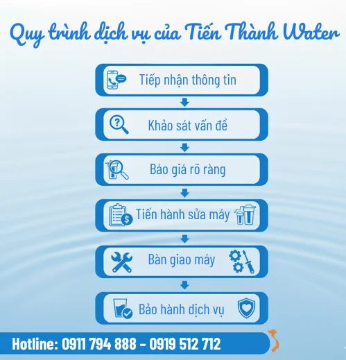 Công ty hỗ trợ kiểm tra, chẩn đoán và khắc phục mọi lỗi thường gặp như: máy không ra nước, nước có mùi lạ, rò rỉ, áp yếu, lỗi van điện… Đồng thời, Tiến Thành Water còn cung cấp dịch vụ thay lõi lọc chính hãng, giúp máy hoạt động ổn định và đảm bảo chất lượng nước tinh khiết cho gia đình bạn.